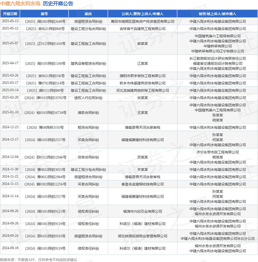 本站消息,根据天眼查APP显示,近日公布了一则中建六局水利水电建设集团有限公司作为被告/被上诉人的开庭公告,详细内容如下: